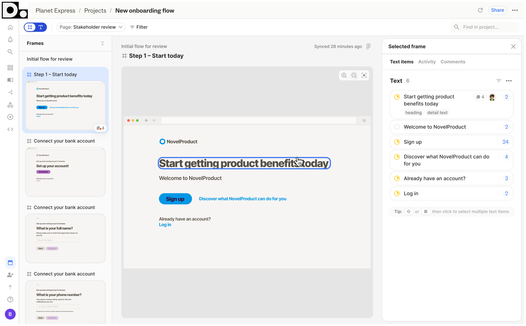 • In design view, the details panel filters comments and activity to the current frame. Text items linked within the selected frame will also display here, as opposed to separately on the left.