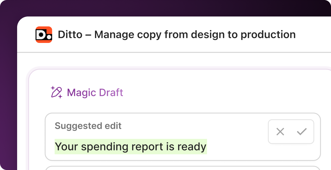 Magic Draft lives inside Ditto’s Figma plugin. No switching tabs. No copy-paste. No wild west of custom GPTs for every team member. Select a text layer, click Magic Draft, and get a contextual first draft in seconds. Accept it, refine it, or regenerate — all in the flow.